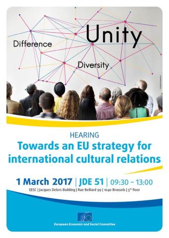 Ces mesures ont pour objectif de faire de l'UE un acteur mondial plus fort en tirant parti de la complémentarité et des synergies dans les activités culturelles des États membres. Le CESE élabore actuellement un avis sur cette communication avec M. Luca Jahier, comme rapporteur. Dans le cadre des travaux préparatoires de l'avis, une audition aura lieu le 1er mars afin d'entendre la perspective de la société civile, des institutions multilatérales et d'autres opérateurs culturels.